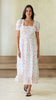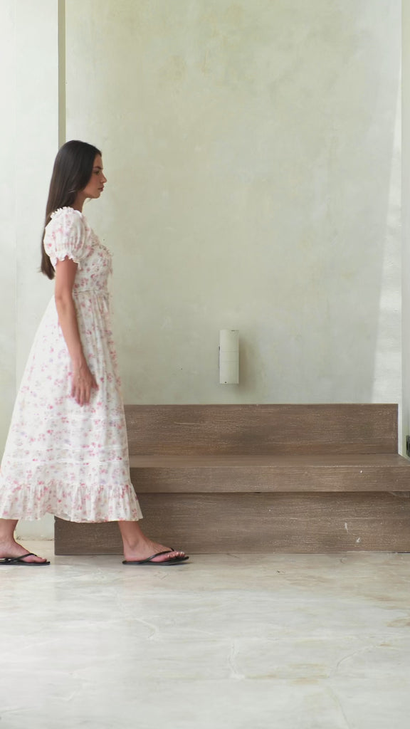 Inspired by our best-selling Zoe dress, the Stevie dress has short sleeves and a beautifully detailed skirt with lace and a flounce. The neckline has flouncy details and is elastic all around. It also has a built in string, making the dress very comfortable and giving you the option to choose how to wear it. The waist is smocked and has stretchy seams. Made from super soft cotton voile, this dress feels light, soft, and very comfortable to wear all day.