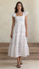 The Leonora Lace Dress is made in soft lace fabric with a stretchy, smocked chest for comfort and a flattering fit. It has beautiful ruffle-trimmed shoulder straps, a midi length, and ruffle details on the skirt. The dress is lined with a light fabric that falls just above the knee. Perfect for special occasions, it lets you feel dressed up while staying comfortable, even over a growing baby bump.